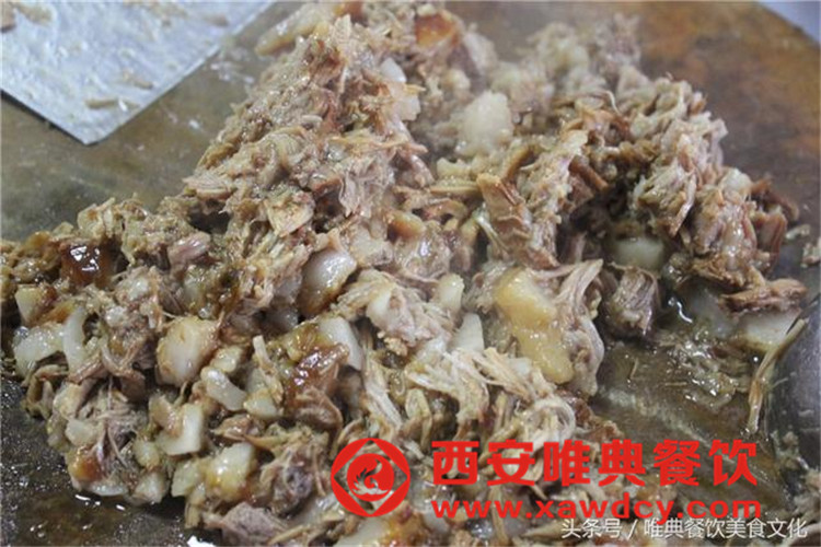 肉鹵好后切碎,夾入饃中,成品就出來(lái)了。