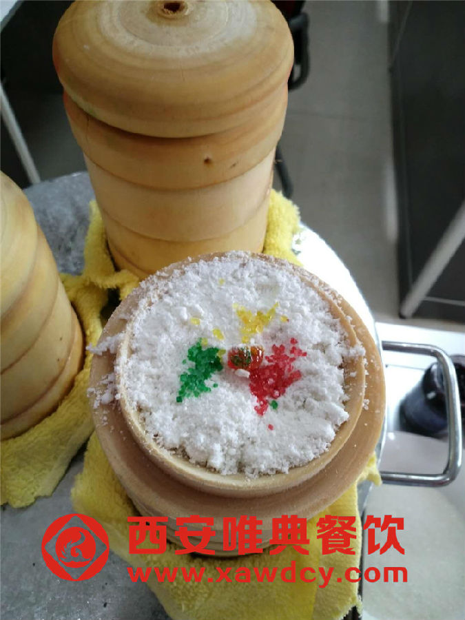 鏡糕是陜西關(guān)中地區(qū)的一種特色小吃,外形小如鏡,也圓如鏡,厚不盈指。做法是把江米細細研磨成粉,在小巧如玩具的竹木籠屜里墊上薄鐵片,填實江米粉,撒上紅糖、綠色和黃色的糖,加上細細切碎的青紅絲,一屜一屜的摞起來,如寶塔般,寶塔尖有一機關(guān),待到熟透時蒸汽一沖,發(fā)出長長的響聲,兒童聞聲而至。